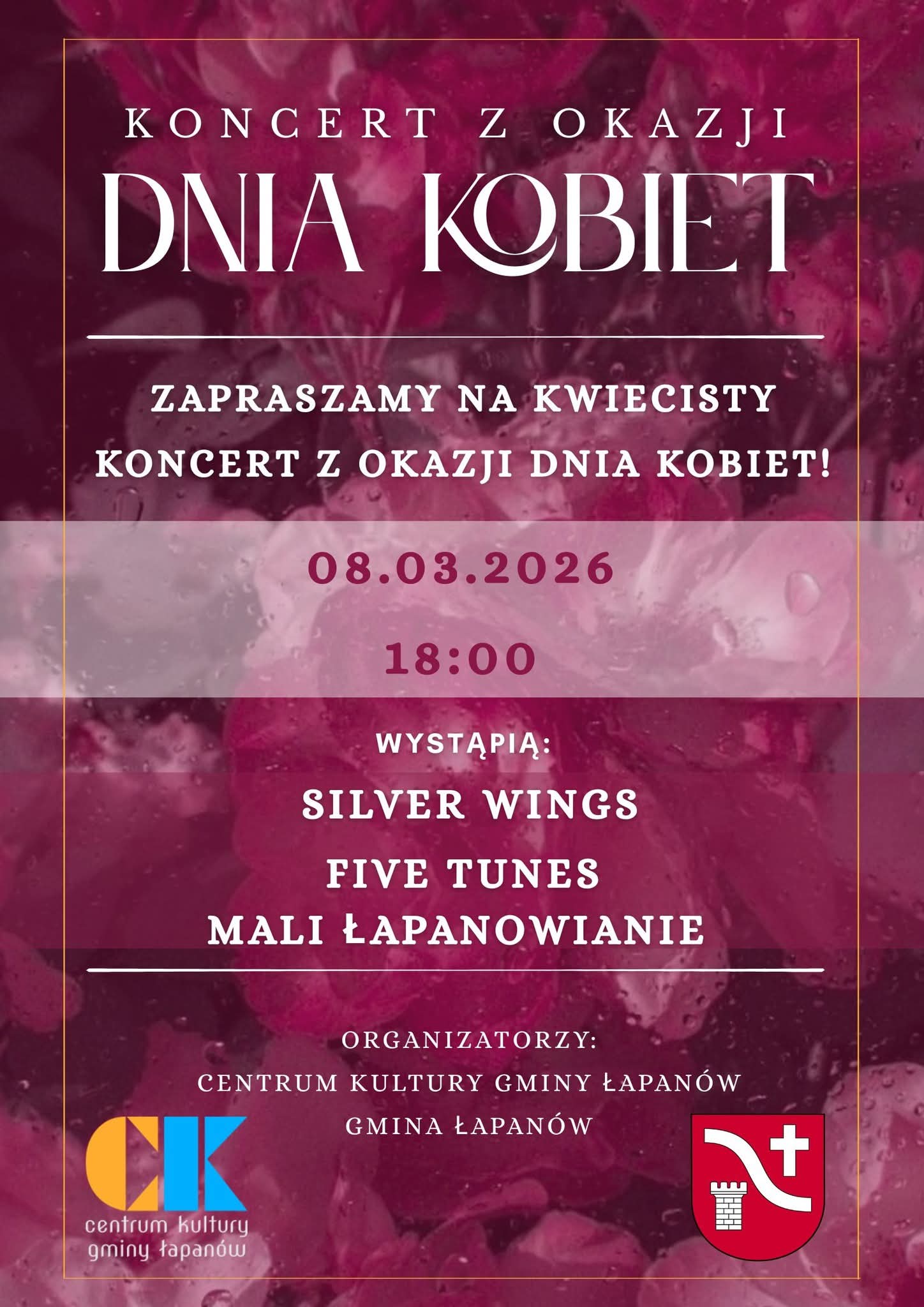 Serdecznie zapraszamy na Koncert z Okazji Dnia Kobiet. Dom Kultury w Łapanowie 8 marca 2026r. godz.18.00